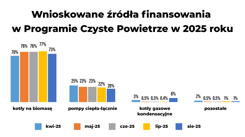 Co ważne, zainteresowanie biomasą rosło dynamicznie już wcześniej. W 2024 r. udział tych urządzeń wzrósł z 17% do 48%, a w nowej odsłonie programu, działającej od wiosny 2025 r., instalacje na biomasę utrzymują stabilnie wysoki poziom - 70% i więcej.